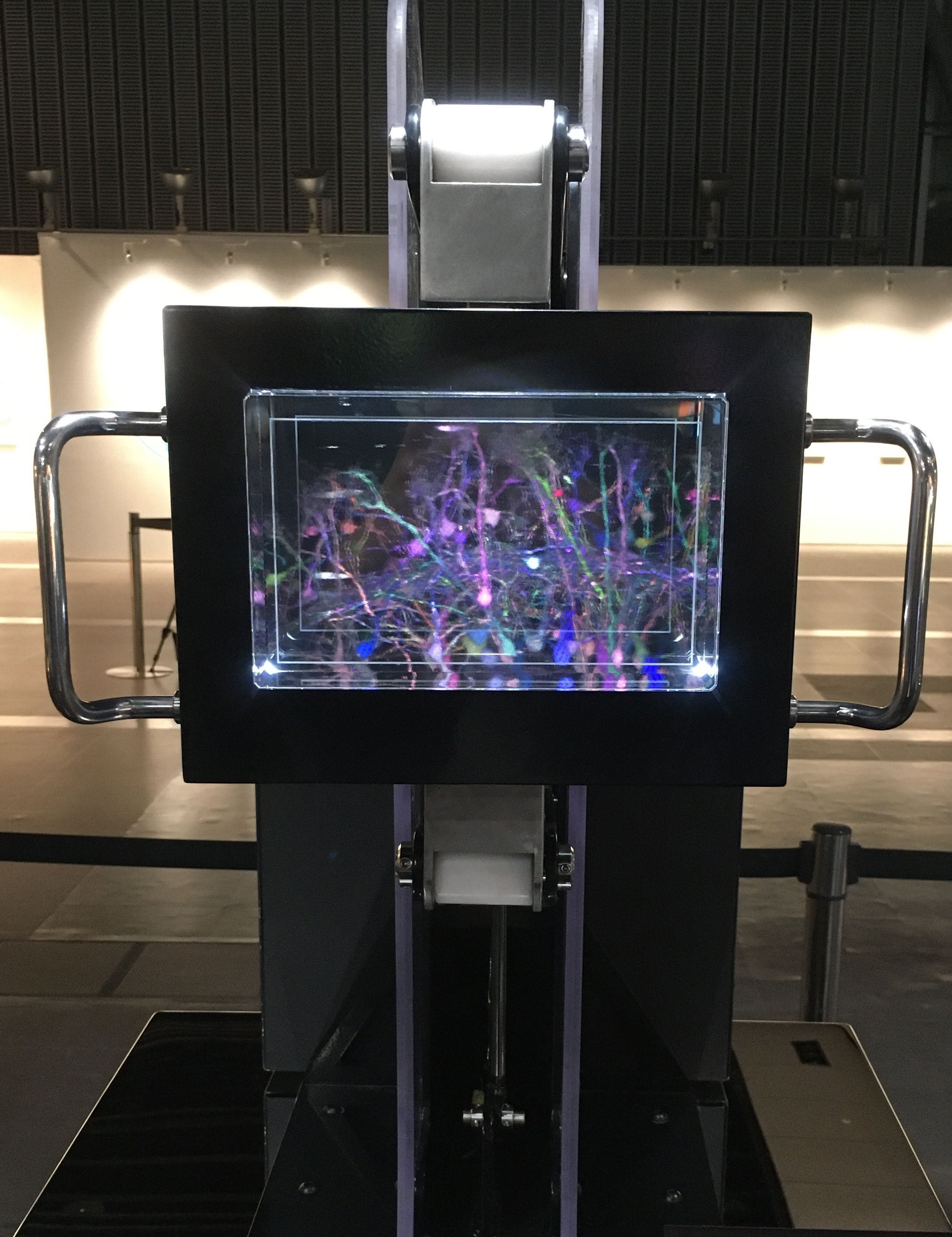 Tetbowのカラフルな蛍光顕微鏡写真が日本科学未来館(東京、お台場)に展示されました。昨年まで大学生として在籍した坂口君の作品です。新しい常設展「計算機と自然、計算機の自然」の一角にホログラフィックディスプレイを用いて立体展示されています。是非お立ち寄り下さい。