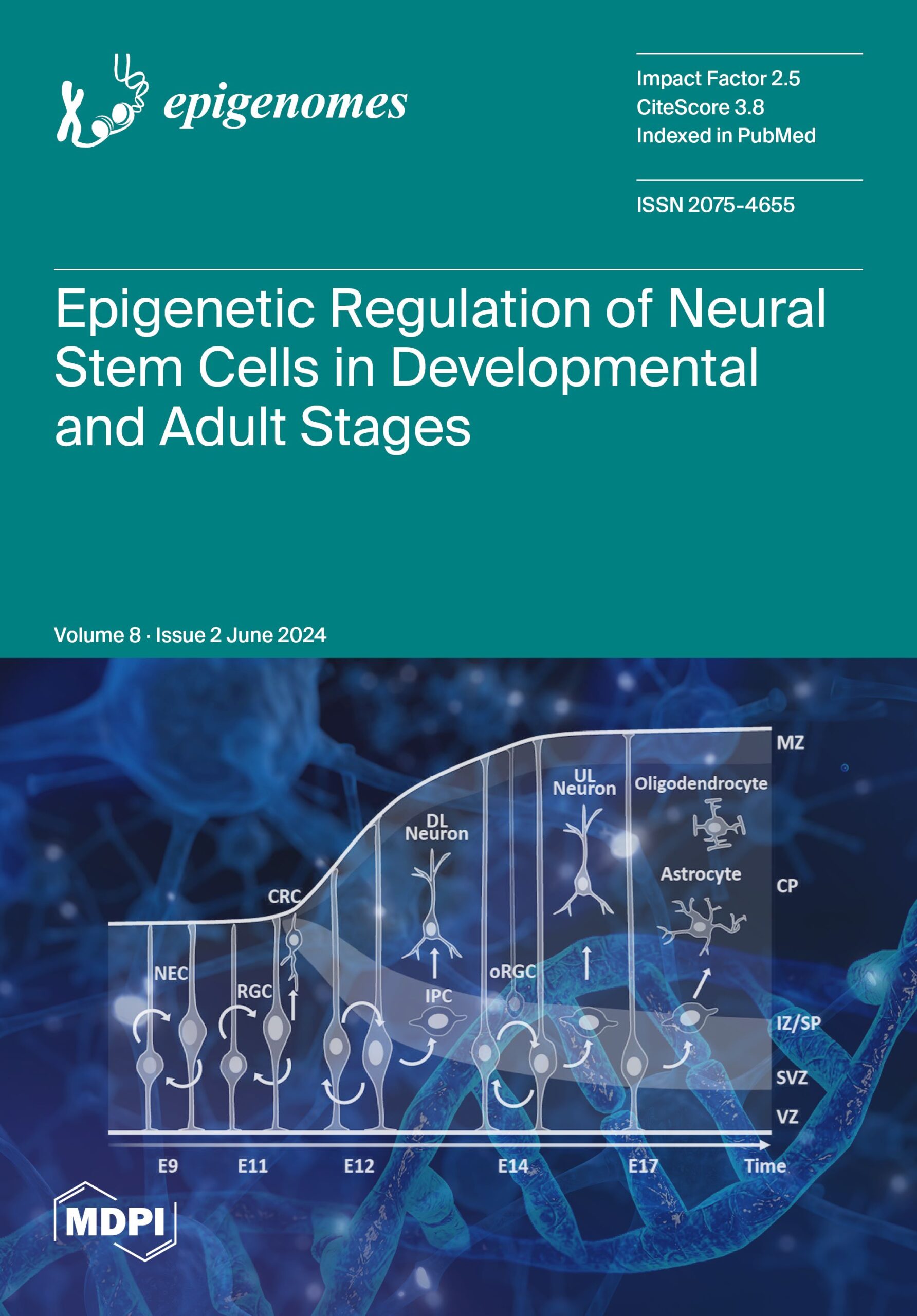 Epigenomes, Volume8 Issue 2(June 2024)の表紙に、6月4日に掲載された「Epigenetic Regulation of Neuronal Stem Cells in Developmental and Adult Stages」のFigure1が採用されました。