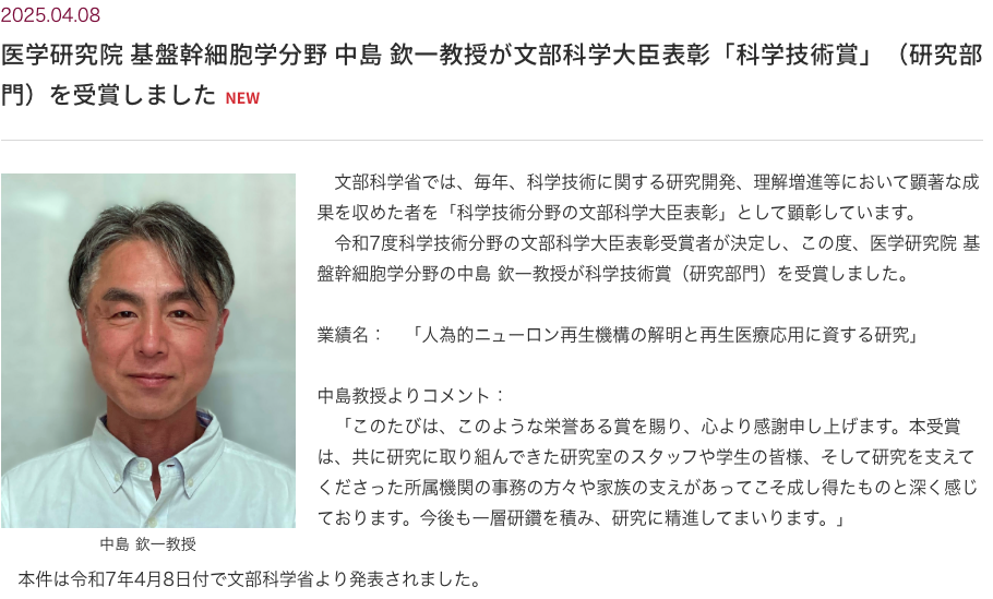 この度、本研究室の中島欽一教授が文部科学大臣表彰科学技術賞(研究部門)を受賞しました。